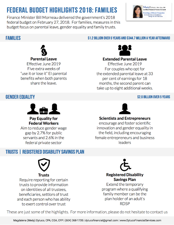 The government is creating a new five-week “use-it-or-lose-it” incentive for new fathers to take parental leave. This would increase the EI parental leave to 40 weeks (maximum) when the second parent agrees to take at least 5 weeks off. Effective June 2019, couples who opt for extended parental leave of 18 months, the second parent can take up to 8 additional weeks, at 33% of their income.