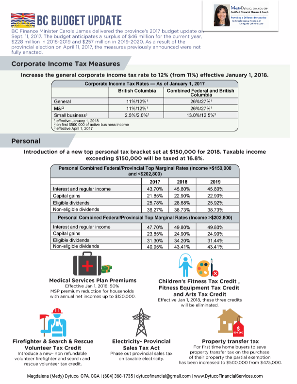 BC Finance Minister Carole James delivered the province’s 2017 budget update on Sept. 11, 2017. The budget anticipates a surplus of $46 million for the current year, $228 million in 2018-2019 and $257 million in 2019-2020. As a result of the provincial election on April 11, 2017, the measures previously announced were not fully enacted.